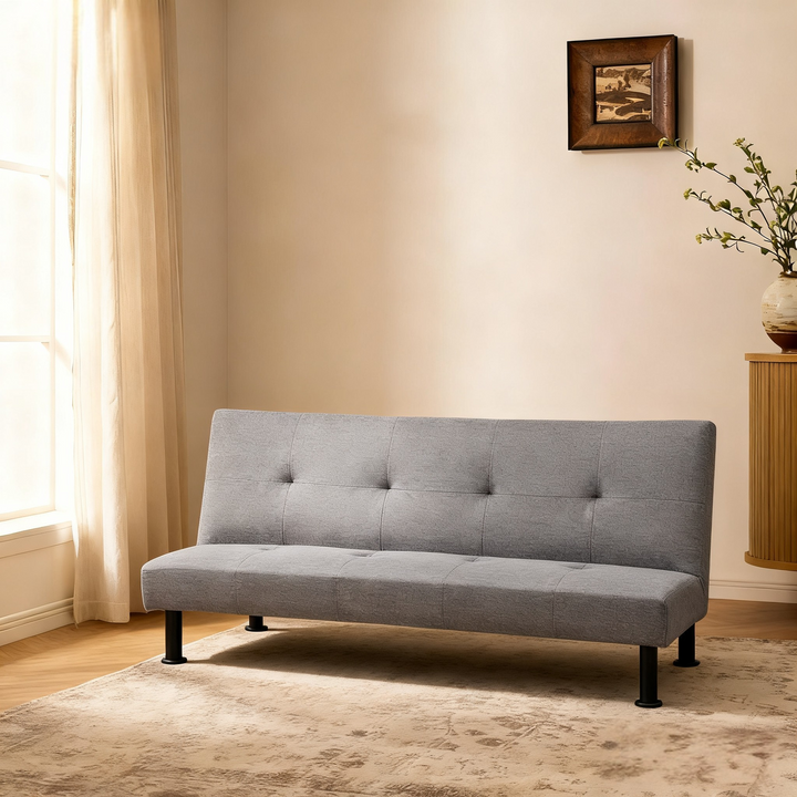 The futon sofa features supportive cotton cushioning and a soft linen fabric cover, creating a cozy lounging area. Its design is perfect for enhancing comfort in your living room, bedroom, or guest room.